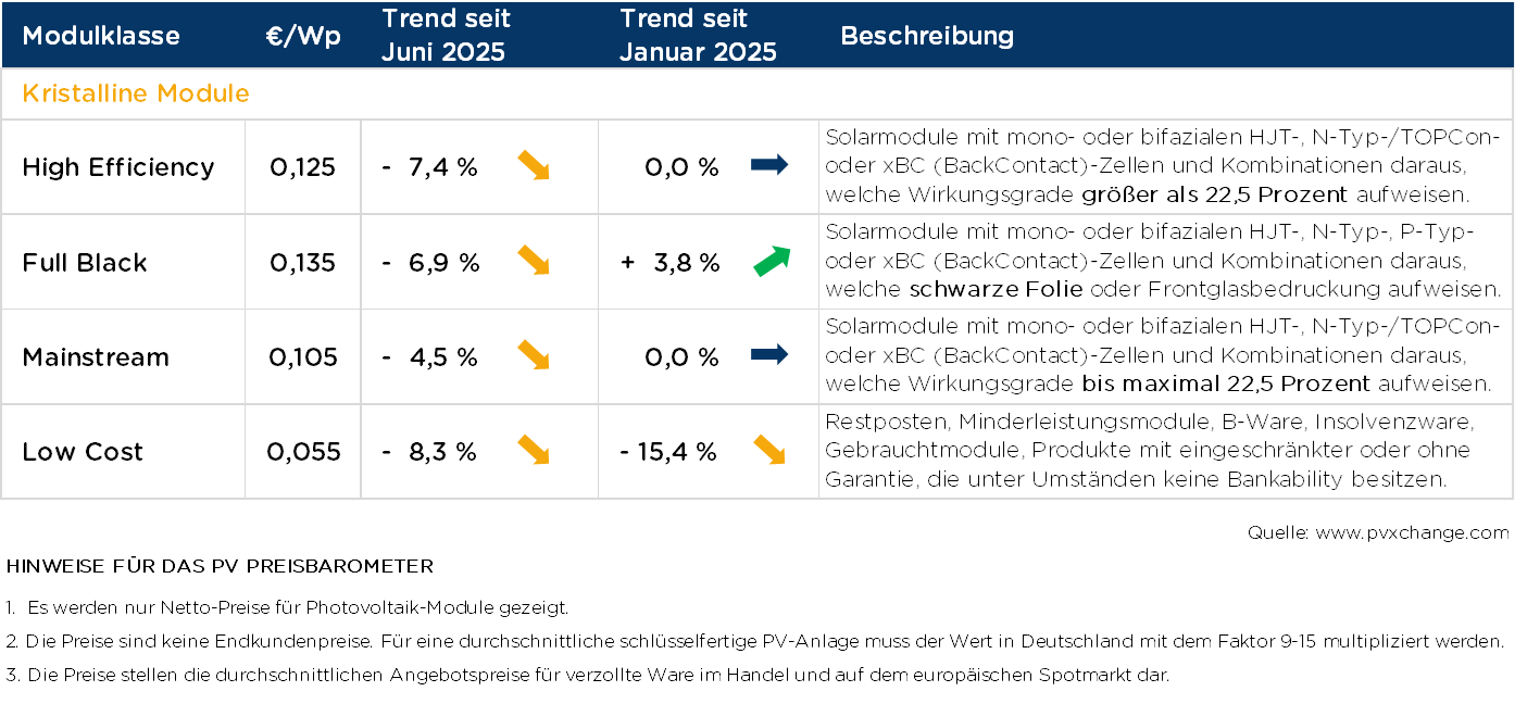 Diese Preissenkungen gehen aber nicht vollständig zu Lasten der Zwischenhändler, da die Entwicklung bereits durch fallende Siliziumpreise in China eingeleitet wurde. Auch hat die Binnennachfrage dort nach Auslaufen von Fördermaßnahmen abgenommen, so dass wieder vermehrt preiswerte Module für den Weltmarkt zur Verfügung stehen. So liegt das Preisniveau bei bifazialen Glas-Glas-Modulen für große Photovoltaik-Freiflächenanlagen schon wieder – beziehungsweise immer noch – deutlich unter zehn Eurocent pro Wattpeak, selbstverständlich fertig geliefert auf die europäische Baustelle.