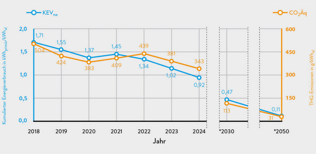 Analog zum Emissionsrückgang der letzten Jahre ist der Primärenergieeinsatz gesunken: Im vergangenen Jahr wurden pro Kilowattstunde Strom rechnerisch 0,92 Kilowattstunden Primärenergie aufgewendet. Damit wurde erstmals mehr elektrische Energie an Endkunden geliefert als dafür an Primärenergie eingesetzt wurde. Im Vorjahr lag dieser sogenannte KEV-Wert („nicht-erneuerbare kumulierte Energieverbrauch“) bei 1,02; in 2022 waren es 1,34 Kilowattstunden. Für 2030 sagen die IINAS-Experten auf Basis der NECP ein Verhältnis von 0,47 voraus, für 2050 von 0,11.