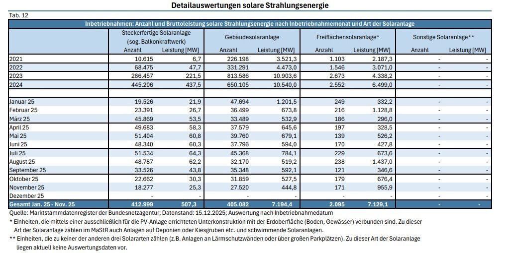 Dagegen auf den tiefsten Stand im laufenden Jahr sank die bislang für November gemeldete Zahl neuer Dachanlagen. Es waren nach der Veröffentlichung der Bundesnetzagentur 27.520 neue Dachanlagen mit 444,8 Megawatt Gesamtleistung. Dazu kommen für den November noch 18.277 neu registrierte Stecker-Solar-Geräte mit insgesamt 25,3 Megawatt Leistung. Auch dies stellt den bislang niedrigsten Wert im laufenden Jahr dar, zumindest wenn man die Anzahl der neu gemeldeten Systeme betrachtet.