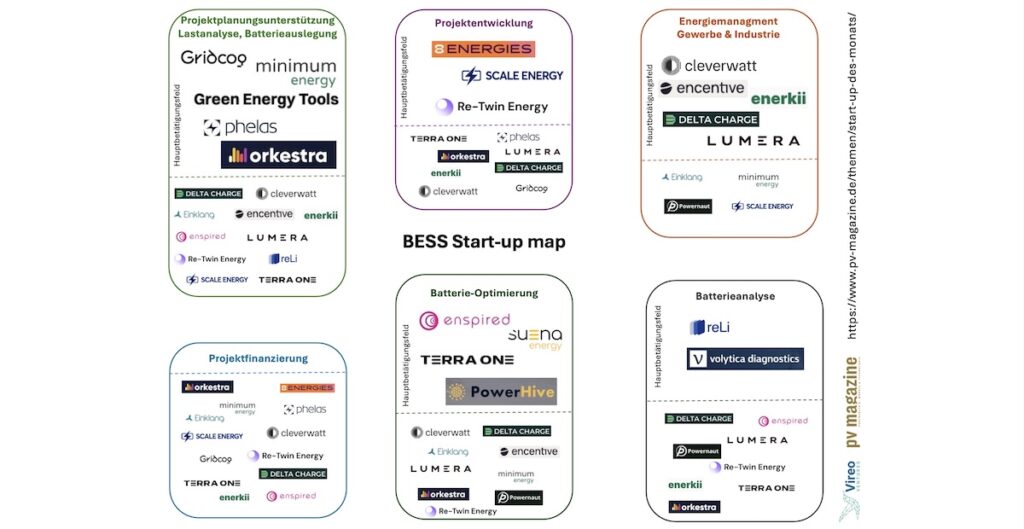 Vireo ventures und pv magazine haben daher begonnen, eine Übersicht zu erstellen, die zeigt, in welchen Bereichen Batterie-Start-ups aktiv sind und welche Produkte und Dienstleistungen sie anbieten. Jedes Unternehmen konnte ein primäres Betätigungsfeld (in der Grafik groß) sowie mehrere sekundäre Betätigungsfelder angeben (in der Grafik etwas kleiner). Viele beschränken sich nicht auf Batteriespeicher, doch für alle sind diese ein zentrales Element ihres Geschäftsmodells.