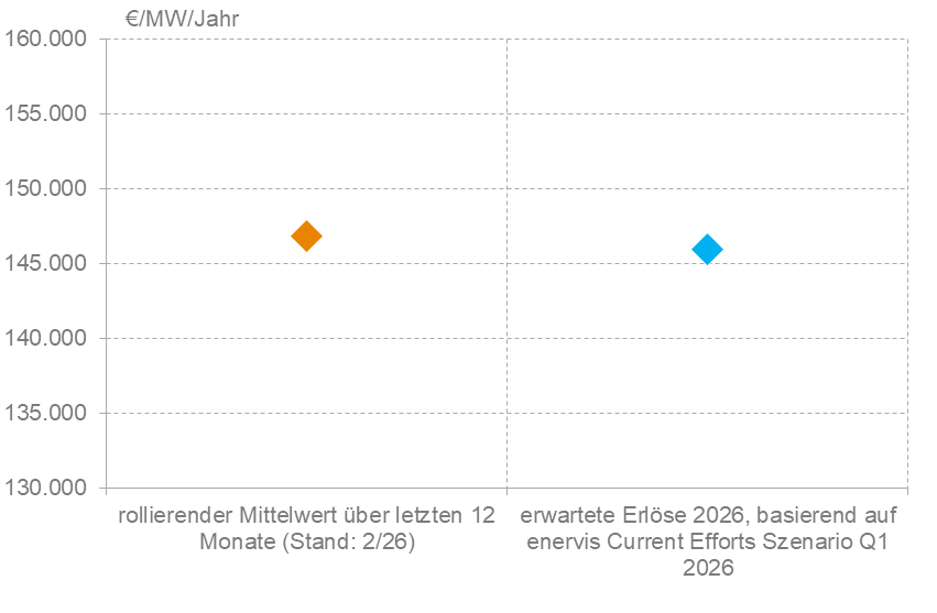 Für das Erlöspotenzial im Gesamtjahr liegt weiterhin unser Current Efforts Szenario Q1/2026 zugrunden Aktualisierung des Szenarios erfolgte in diesem Monat nicht. Die prognostizierten Erlöse liegen aktuell bei 145.900 Euro pro Megawatt. Es ist leicht unter dem Durchschnitt der erzielbaren Erlöse der vergangenen zwölf Monate, bewegen sich jedoch weiterhin im selben Größenordnungsbereich, wie im enervis Batteriespeicher-Index dargestellt. Die Speicherparameter wurden dabei unverändert beibehalten.
