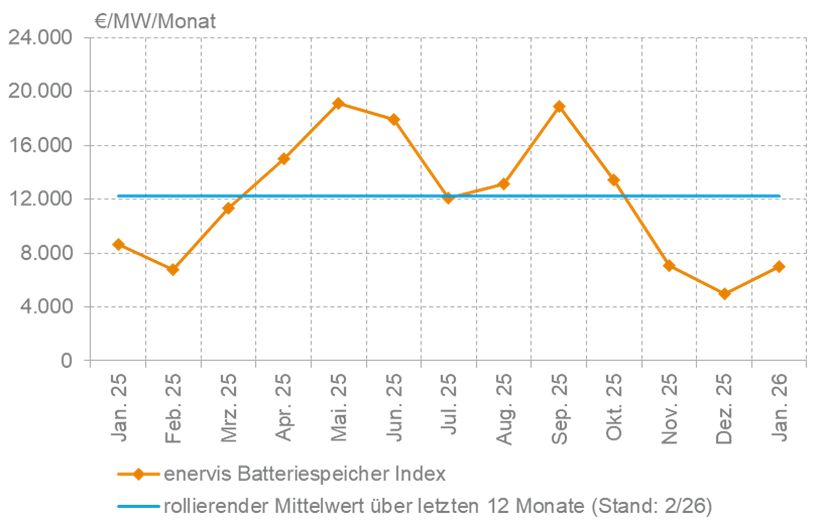 Die monatlich erzielbaren Erlöse schwankten in den letzten 13 Monaten erheblich. Das Maximum wurde im Mai 2025 mit 19.100 Euro pro Megawatt pro Monat erreicht, während das Minimum im Dezember 2025 bei 5.000 Euro pro Megawatt pro Monat lag. Tendenziell sind die Batterieerlöse in den Sommermonaten höher, dies ist auf die in den Monaten sehr starke Photovoltaik-Erzeugung bei gleichzeitig geringer Gesamtstromnachfrage zurückzuführen. Flankierend ist die konventionelle Erzeugungskapazität saisonal bedingt in den Sommermonaten weniger am Netz, unter anderem aufgrund von Wartungsarbeiten und möglicherweise geringerer Effizienz bei Gaskraftwerken aufgrund hoher Temperaturen.