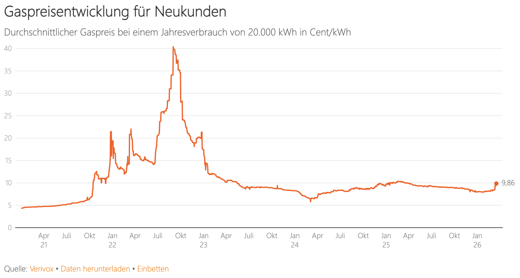 Auch bei Gas ist ein Anstieg erkennbar, wenn auch moderater. Für Neukunden liegt der Preis derzeit bei 9,8 Cent pro Kilowattstunde, nach rund 7,99 Cent im Dezember. In der Grundversorgung werden aktuell etwa 13,6 Cent pro Kilowattstunde fällig. Unklar ist, welcher Anteil des Preisanstiegs auf geopolitische Risiken und welcher auf vergleichsweise niedrige Speicherfüllstände zurückzuführen ist.