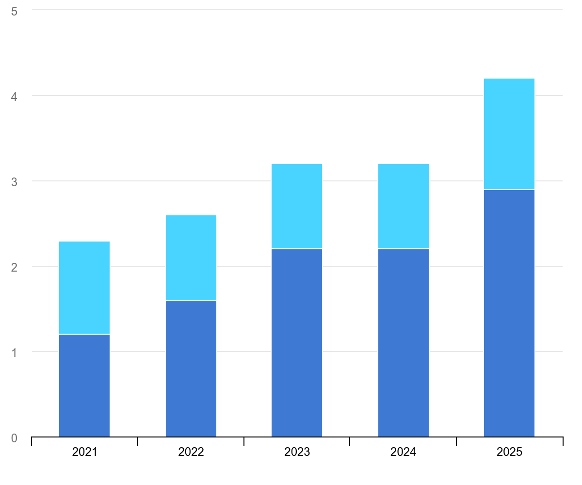 Absatz von Elektroautos in Europa, 2021-2025. Dunkelblau: Batterieelektrische Fahrzeuge, Hellblau: Plug-In-Hybride