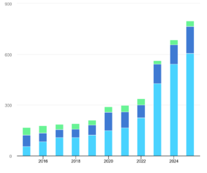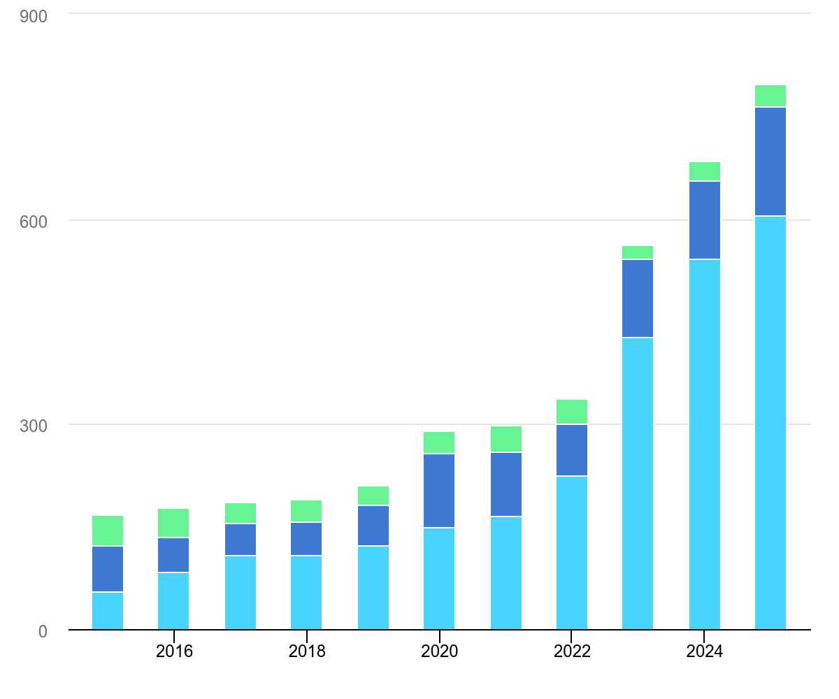 Globaler Zubau von Erneuerbare-Leistung, 2015-2025. Hellblau: Photovoltaik, dunkelblau: Windenergie, Grün: Sonstige Erneuerbare
