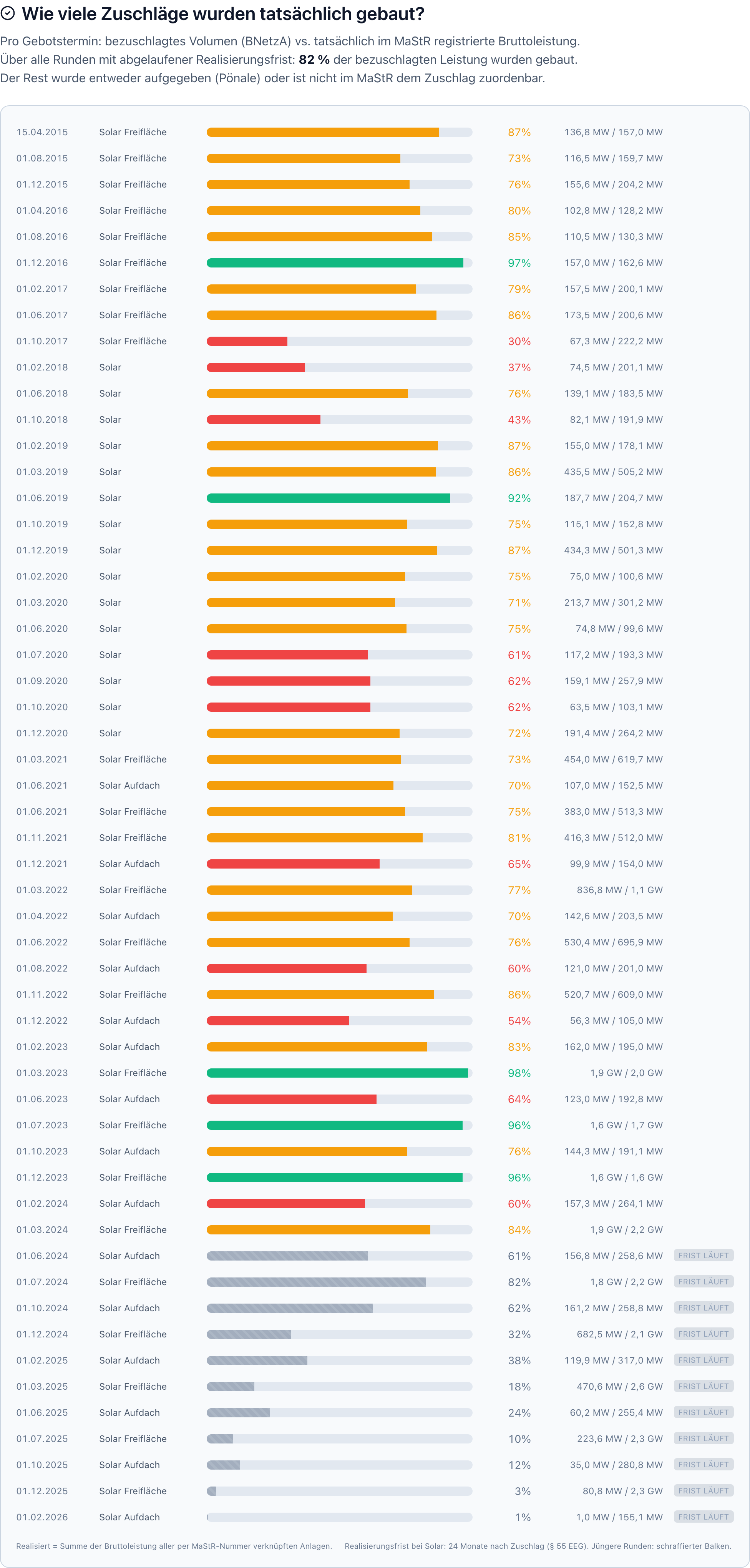 „Die Zuschlagslisten der Bundesnetzagentur zeigen seit 2015, wer einen Zuschlag bekommen hat, aber nicht, ob die Anlage tatsächlich gebaut wurde. Diese Information steckt im Marktstammdatenregister. Wir haben beide Datenquellen über die Zuschlagsnummer verknüpft und so die Realisierungsquote pro Termin berechnet“, erklärt Joschka Beckers, Technische Leitung und Mitbegründer von Ohmnify. Durchschnittlich sind demnach 82 Prozent der bezuschlagten Photovoltaik-Leistung auch tatsächlich realisiert worden.