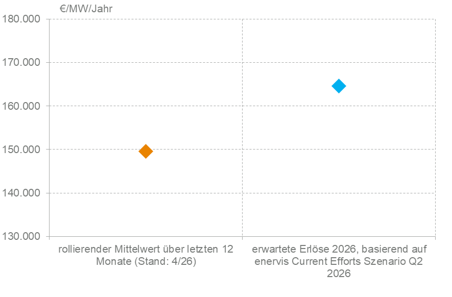 Für die erzielbaren Erlöse im Gesamtjahr 2026 wurde das zugrunde liegende Strompreisszenario von enervis auf das Q2/2026-Szenario aktualisiert. Die modellierten Erlöse im neuen Szenario liegen deutlich über denen des Q1/2026-Szenarios. Insgesamt fallen die Erlöse um rund 18.700 Euro pro Megawatt höher aus, was einem Anstieg von etwa 13 Prozent entspricht. Höhere kurzfristige Basispreise sowie größere Spreads an den Spotmärkten, getrieben durch die Aufwärtsanpassung der Brennstoffpreisannahmen infolge des aktuellen Konflikts im Nahen Osten, führen zu diesem höheren Erlösniveau.