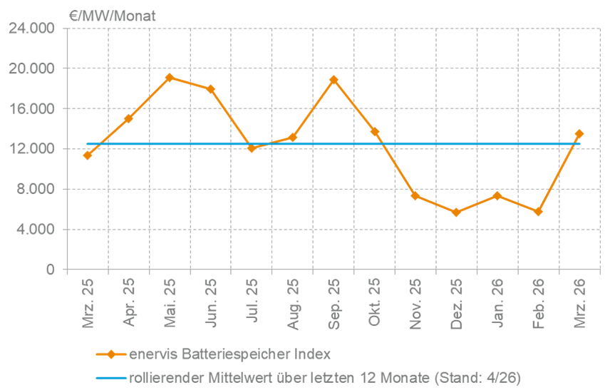 Nach den schwachen Wintermonaten sind die erzielbaren Batteriespeicher–Erlöse im März deutlich gestiegen und lagen im Durchschnitt bei rund 13.500 Euro pro Megawatt. Dies entspricht einem Anstieg von 133 Prozent gegenüber Februar und liegt etwa 19 Prozent über dem Niveau von März 2025. Die Spreads an den Spotmärkten nahmen deutlich zu und wurden durch eine höhere Volatilität getrieben. Eine Kombination aus dem anhaltenden Konflikt im Nahen Osten, der die Gaspreise steigen ließ und in der Folge zu höheren täglichen Spitzenpreisen führte, sowie ein erneuter Anstieg der Photovoltaik-Erzeugung, der vermehrt zu Phasen mit sehr niedrigen oder sogar negativen Preisen führte, weitete die Spreads aus und verbesserte die Arbitragemöglichkeiten für Batteriespeicher. Parallel dazu zogen die Preise für Primärregelleistung und negative Sekundärregelleistung wieder an und unterstützten das Erlöspotenzial zusätzlich.
