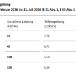 Neue Dachanlagen bis 100 Kilowatt, die ab Februar in Betrieb gehen erhalten ab Februar bei Teileinspeisung zwischen 5,50 und 7,78 Cent pro Kilowattstunde. Die EEG-Vergütung für Volleinspeiser sinkt ebenfalls um ein Prozent auf 10,35 bis 12,34 Cent pro Kilowattsunde.