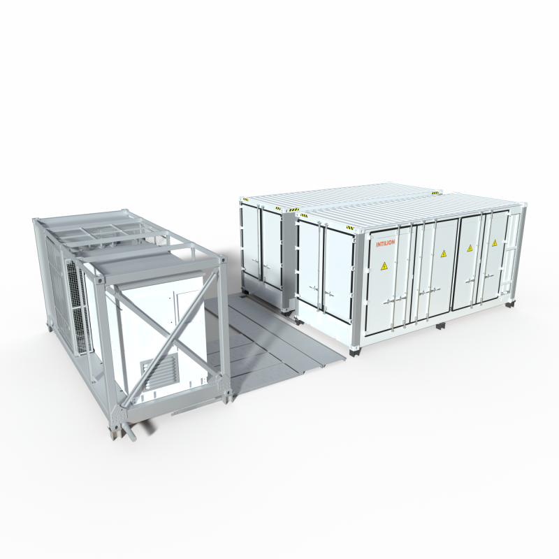 | Weitere Hardware | Outdoor-Gehäuse IP55, Klimaanlage und Wasserkühlung für die Batterie, Luftkühlung für Wechselrichter, Gas- und Temperaturmelder inkl. Aerosollöschung, Dry Pipe, EMS mit Intilion Application Unit, Kompatibilität zu marktüblichen EMS- und Monitoringsystemen, Trafo, Mittelspannungsschaltanlage, Intilion Control Unit |