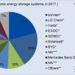 Nicht nur in Deutschland, auch in anderen europäischen Ländern ist die Nachfrage nach Speichern für Photovoltaik-Anlagen deutlich angezogen. EuPD Research schätzt, dass 2017 etwa 50.000 Systeme neu installiert wurden. Die drei größten Anbieter lieferten gut die Hälfte der Photovoltaik-Heimspeicher.