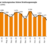 Der Zuwachs ist vor allem auf sehr große Gewerbe- und Freiflächenanlagen zurückzuführen. Die Zubauzahlen für April hat die Bundesnetzagentur von 1040 auf 1177 Megawatt nach oben korrigiert.